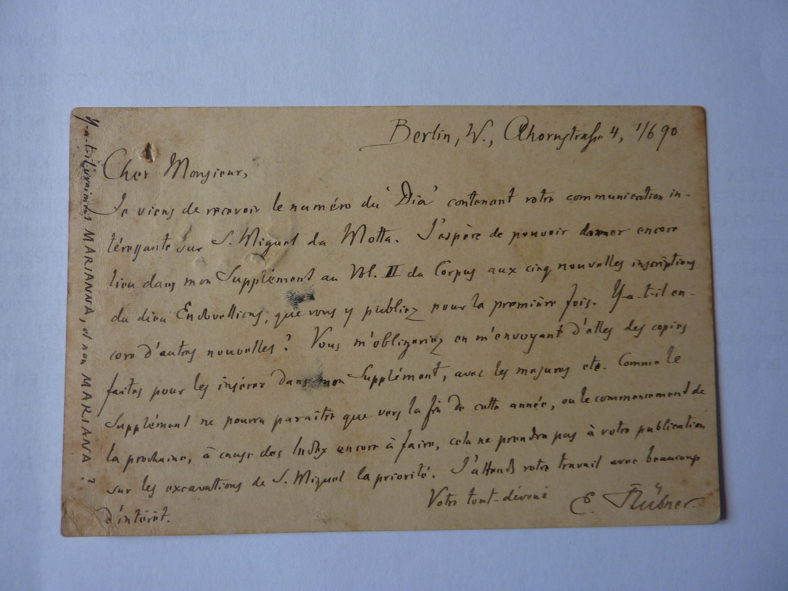 Je viens de recevoir le numéro du ‘Dia’ contenant votre communication intéressante sur S. Miguel da Motta. J’espère de pouvoir donner encore lieu dans mon Supplément au Vol. II du Corpus aux cinq nouvelles inscriptions du dieu Endovellicus, que vous y publiez pour la première fois. Y-a-t-il encore d’autres nouvelles? Vous m’obligeriez en m’envoyant d’elles des copies faites pour les insérer dans mon Supplément, avec les mesures etc. Comme le Supplément ne pourra paraître que vers la fin de cette année, ou le commencement de la prochaine, à cause des Index encore à faire, cela ne prendra pas à votre publication sur les excavations de S. Miguel la priorité. J’attend votre travail avec beaucoup d’intérêt.